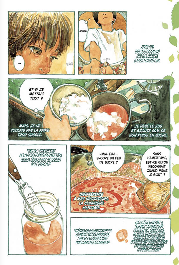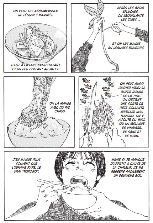En effet, Petite forêt s’articule comme un menu de restaurant : un chapitre, un plat. Tout ce qu’Ichiko cueille dans son potager ou ramasse au fil de ses balades se transforme en met (et ça fait saliver). Qu’il s’agisse de reproduire le souvenir d’un plat de sa mère ou d’utiliser l’excédent de daikon qu’il ne faut surtout pas laisser pourrir, l’imagination culinaire d’Ichiko est sans limite.