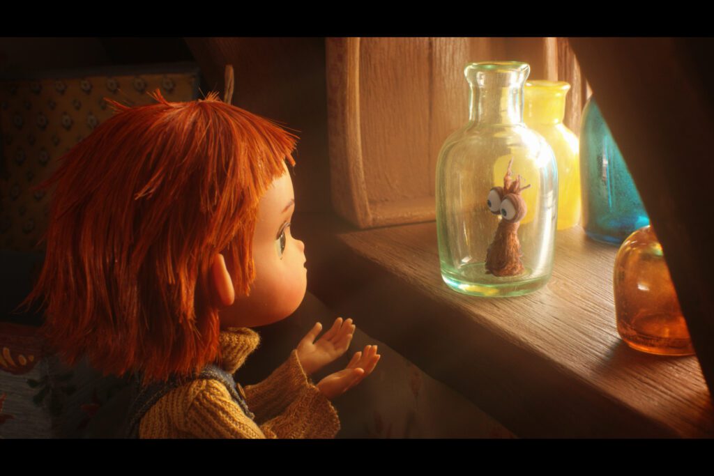 Dans Monsieur Bouteille de Dice Tsutsumi, ancien réalisateur chez Pixar, notre héroïne fait la rencontre d’un drôle de loustic… George ! Mi-crevette, mi-musaraigne, cet étonnant compagnon vit coincé dans une bouteille, sans trop savoir comment il est arrivé là. Qu’il aimerait pouvoir en sortir, découvrir le monde, devenir libre ! Mais quitter un refuge où l’on s’est longtemps senti en sécurité n’est pas si facile… surtout lorsqu’un mauvais sort semble vous y retenir. Grâce à George, la fillette comprend que certaines choses peuvent nous enfermer sans que l’on s’en rende compte… Cela l’aide à regarder son papa autrement : souvent triste et fatigué, lui aussi rêve d’en finir avec sa dépendance à une autre bouteille et de retrouver sa liberté…